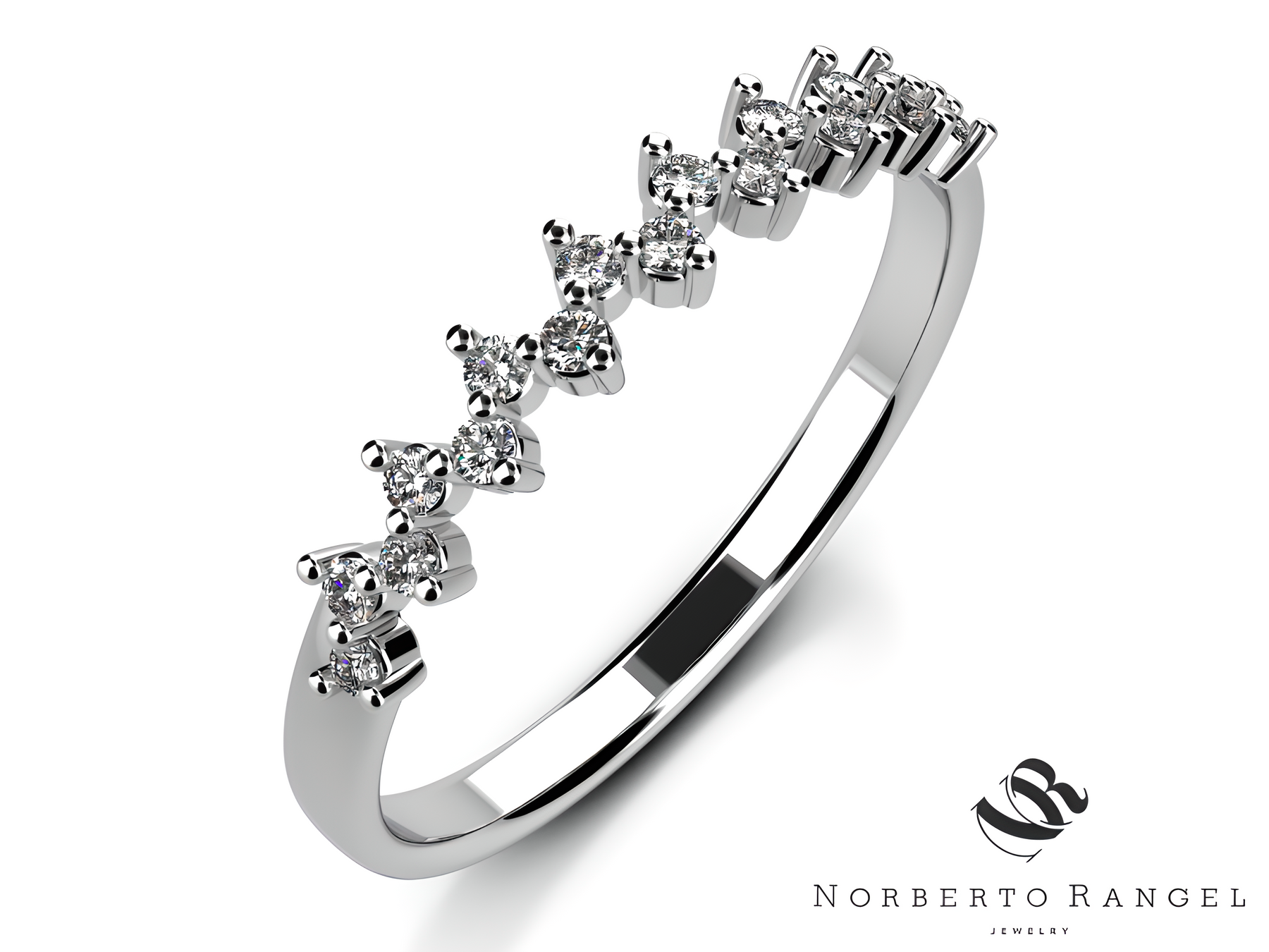Este anillo de estilo tipo band presenta piedras redondas engastadas en línea que aportan un brillo sutil y elegante.